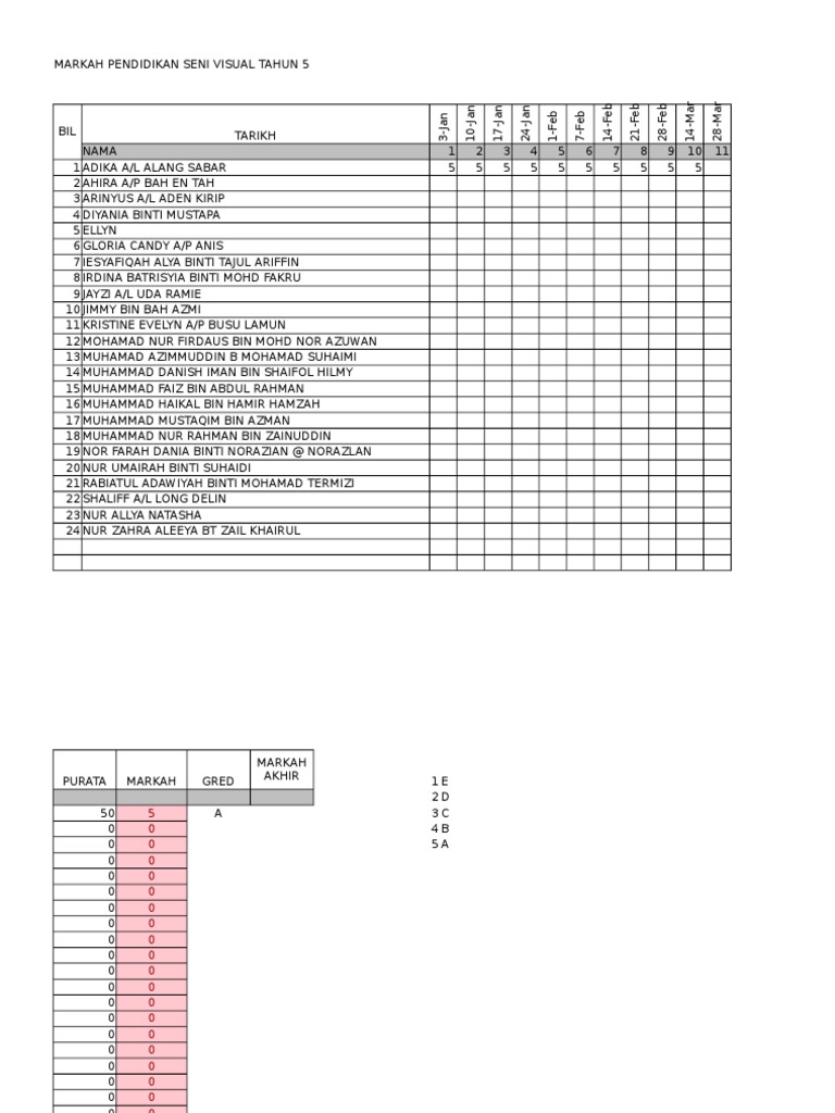 Mengaplikasikan bahasa seni visual dalam penerokaan dan pengkaryaan. Mengenalpasti sesuatu masalah yang berlaku dan menentukan punca. PENTAKSIRAN PENDIDIKAN SENI VISUAL PSV3113E 24 35 Senarai Semak Murid Lemah SENARAI SEMAK MURID DUNIA SENI VISUAL SK AYER HITAM NAMA.
